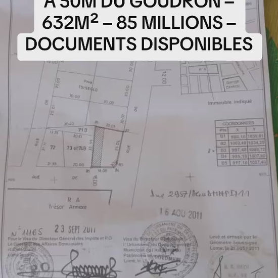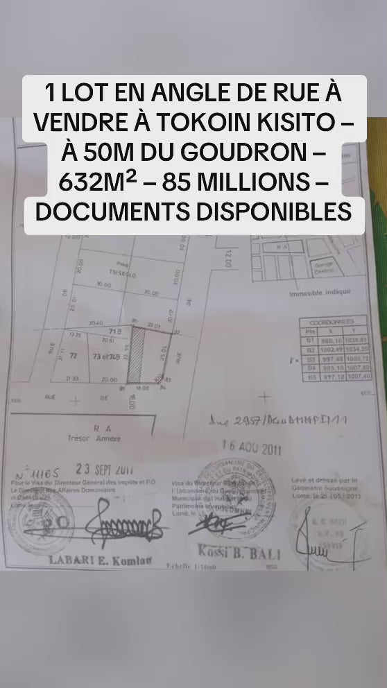 1 LOT EN ANGLE DE RUE À VENDRE À TOKOIN KISITO – À 50M DU GOUDRON – 632M² – 85 MILLIONS – DOCUMENTS DISPONIBLES