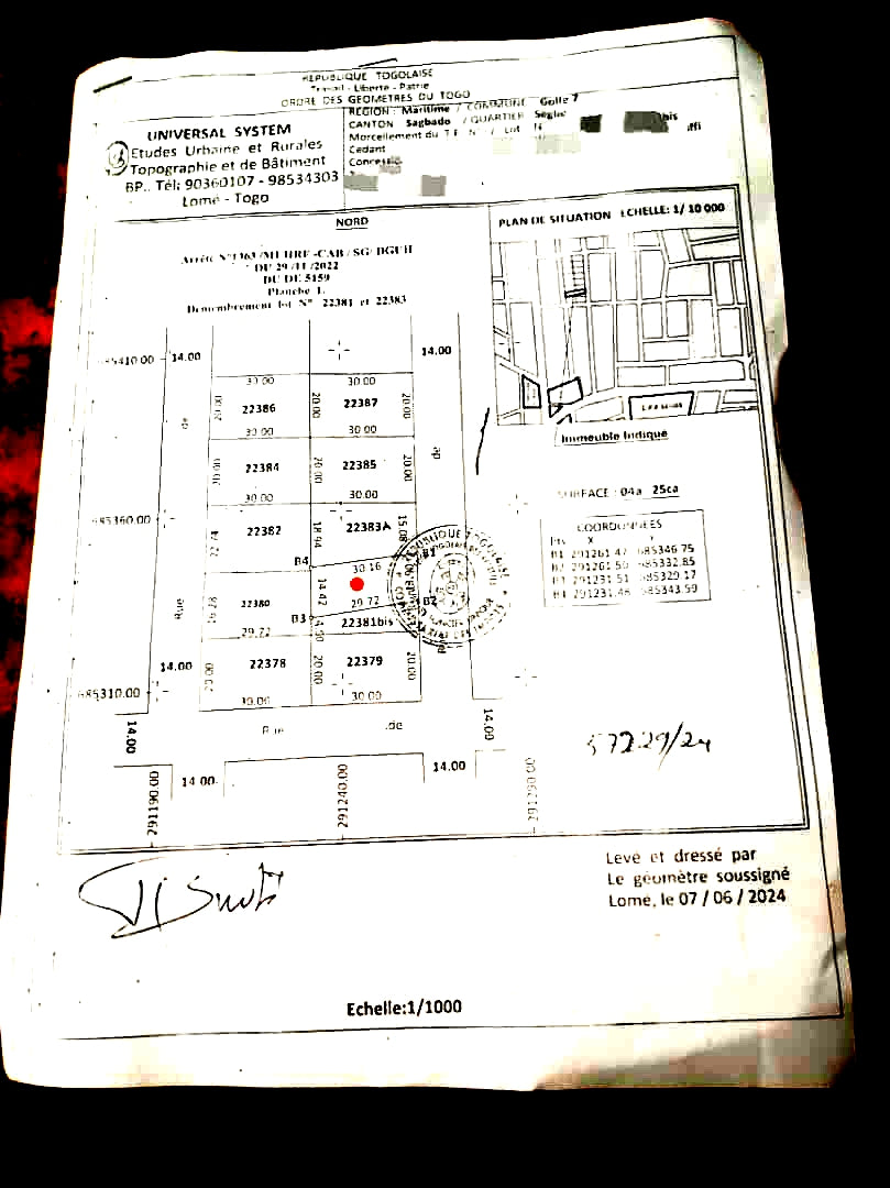 Ce terrain d'environ 425 m² est mis en vente. Il est bien situé, à seulement 250 mètres de la route goudronnée et non loin de la Pharmacie SEGBÉ. Les documents incluent un tampon OTR avec un avis favorable. Le prix est fixé à 16 millions de francs CFA, négociable. Les visites sont facturées.