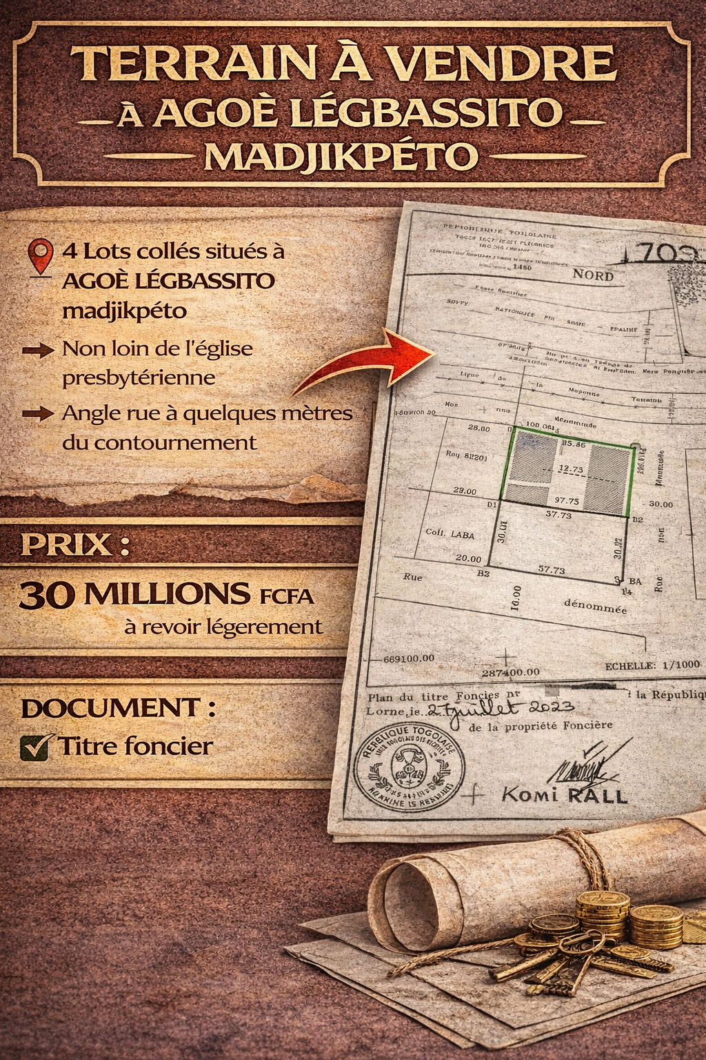 *4 Lots collés* situés à AGOÈ LÉGBASSITO madjikpeto *non loin de l'église presbytérienne*, angle rue à *quelques mettre du contournement*