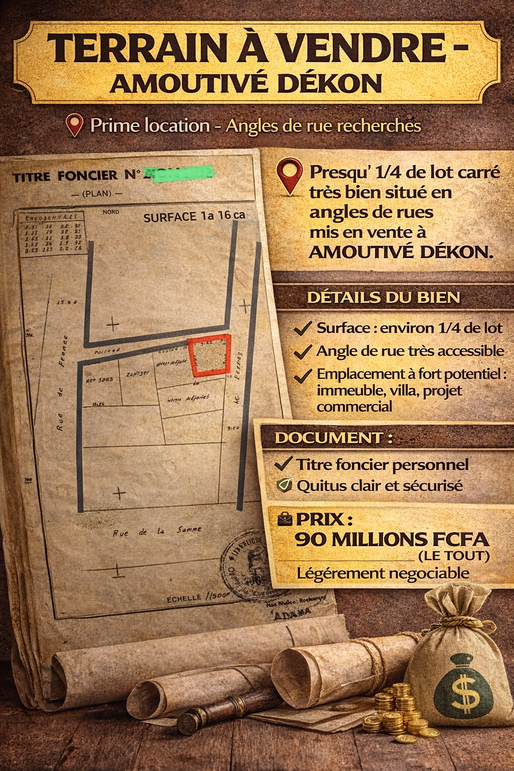 *Presqu' 1/4 de lot carré* très bien situé en *angles de rues* mis en vente à AMOUTIVÉ DÉKON.