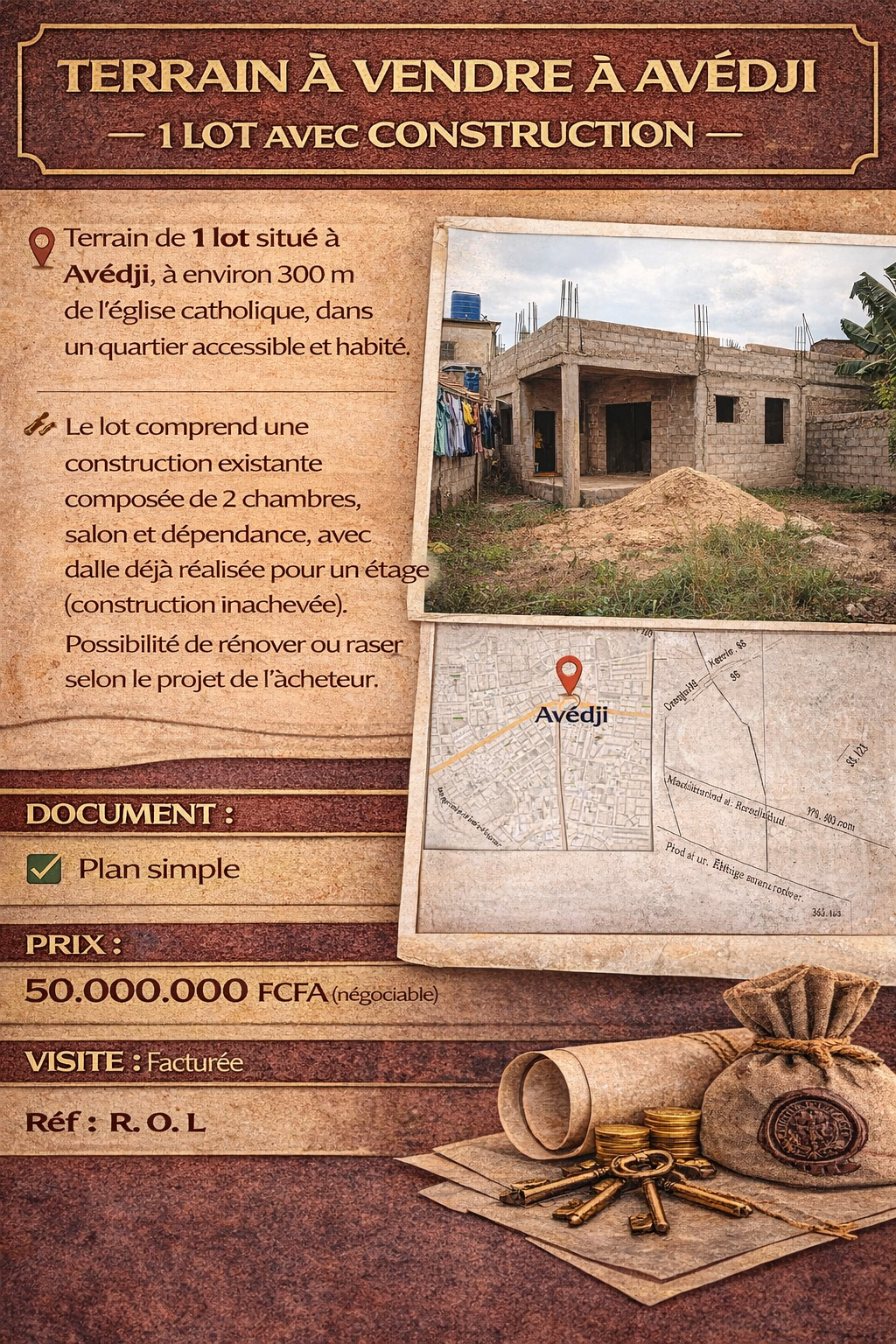 *1 lot* avec *une construction de 02 chambres salon et dépendance dallée et inachevée à l'étage* à raser au choix de l'acheteur, à Avedji à 300m de l'église catholique. *PRIX*: 50 millions FCFA à débattre *PAPIER*: Plan Simple