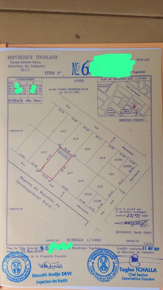 1 lot et 1/2 collés, soit *808 m² clôturés*, situés à Adidogomé derrière la Cité Mokpokpo, en face du grand magasin de l'ANSAT.