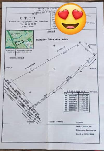 Opportunité rare : 58 hectares disponibles à Glékondji Gilgal, directement en bordure du goudron Lomé – Kpalimé. Terrain idéal pour projets résidentiels, commerciaux ou agricoles.
