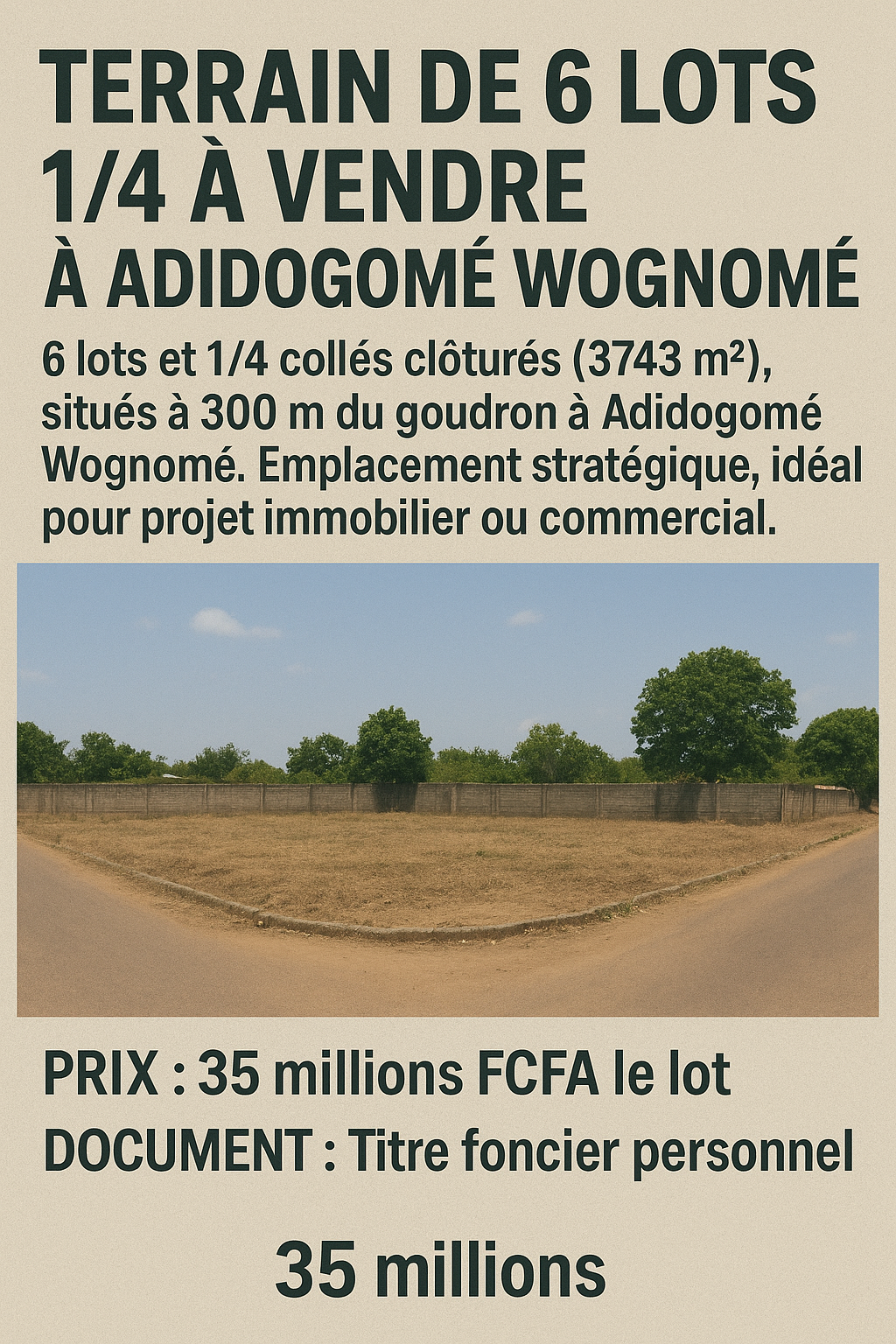 6 lots et 1/4 collés clôturés (3743 m²), situés à 300 m du goudron à Adidogomé Wognomé. Emplacement stratégique, idéal pour projet immobilier ou commercial.