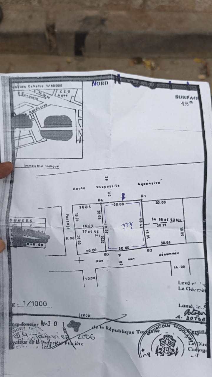Très bon terrain à vendre, idéalement situé à Agoè. La parcelle est composée de 2 lots collés, offrant une surface généreuse. L'emplacement est stratégique, au bord du goudron et à proximité du carrefour bleu. Le bien est accompagné d'un titre foncier personnel, garantissant la sécurité de la transaction. Le prix est indiqué à 200 millions FCFA et est discutable.