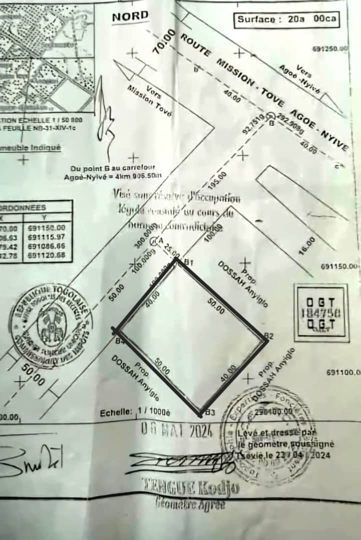 Nous vous proposons un très bon terrain à vendre à Agoè Sogbossito. Cette propriété est composée de 3 lots et 1/3 collés, représentant une superficie totale de 2000 m². Sa position est stratégique, située face à la grande voie express de 50 mètres, avec un accès et une vue directs. Le terrain se trouve à seulement 150 mètres du boulevard de la CEDEAO. Le document disponible pour cette transaction est un titre foncier global.